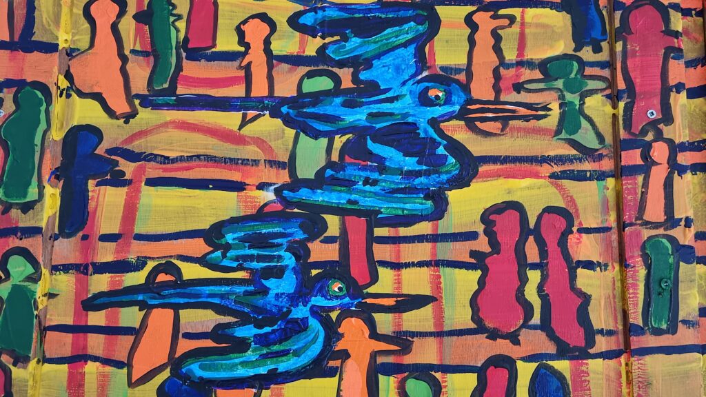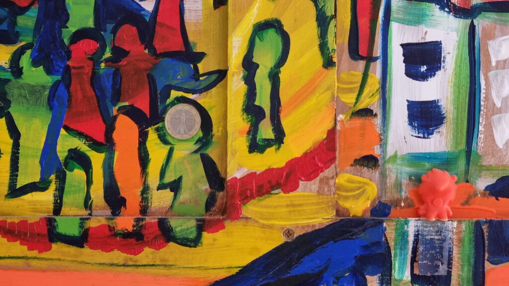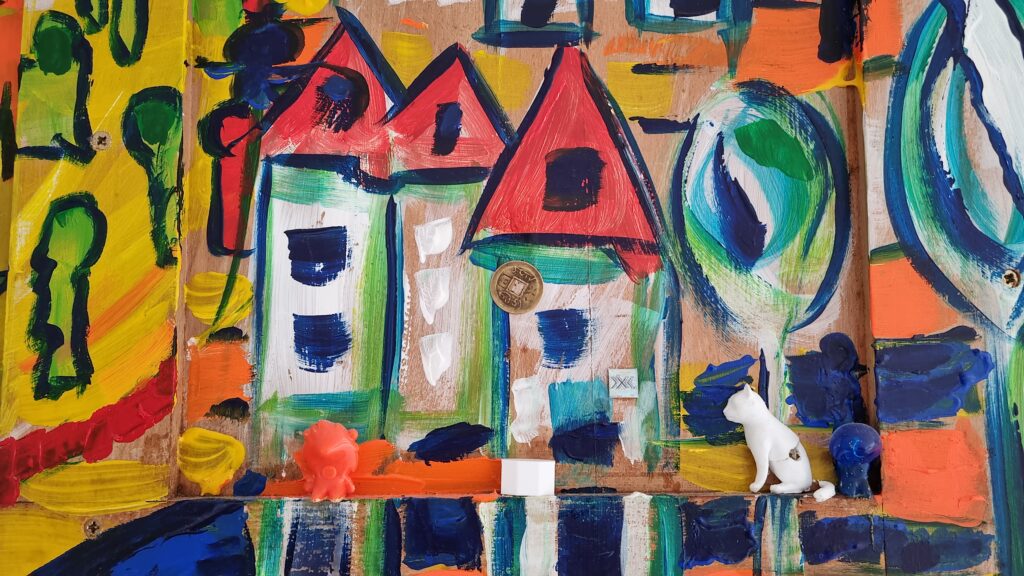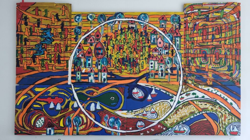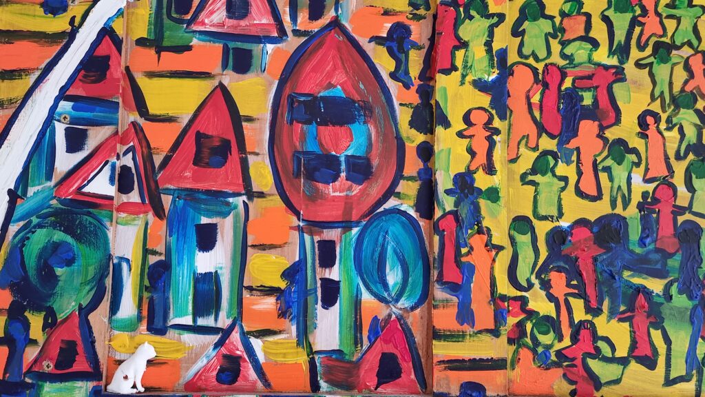 Village Posted on 9 april 20253 april 2026 150 x 230 cm Schilderij op dik eikenhout. 2500 euro. Inclusief selfmade ladenkast